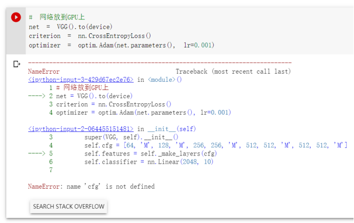 class Net(nn.Module): def __init__(self): super(Net, self).__init__() self.conv1 = nn.Conv2d(3, 6, 5) self.pool = nn.MaxPool2d(2, 2) self.conv2 = nn.Conv2d(6, 16, 5) self.fc1 = nn.Linear(16 * 5 * 5, 120) self.fc2 = nn.Linear(120, 84) self.fc3 = nn.Linear(84, 10) def forward(self, x): x = self.pool(F.relu(self.conv1(x))) x = self.pool(F.relu(self.conv2(x))) x = x.view(-1, 16 * 5 * 5) x = F.relu(self.fc1(x)) x = F.relu(self.fc2(x)) x = self.fc3(x) return x # 网络放到GPU上 net = Net().to(device) criterion = nn.CrossEntropyLoss() optimizer = optim.Adam(net.parameters(), lr=0.001)