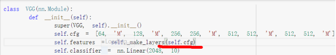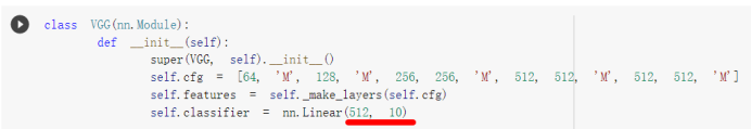 class VGG(nn.Module): def __init__(self): super(VGG, self).__init__() self.cfg = [64, 'M', 128, 'M', 256, 256, 'M', 512, 512, 'M', 512, 512, 'M'] self.features = self._make_layers(cfg) self.classifier = nn.Linear(2048, 10) def forward(self, x): out = self.features(x) out = out.view(out.size(0), -1) out = self.classifier(out) return out def _make_layers(self, cfg): layers = [] in_channels = 3 for x in cfg: if x == 'M': layers += [nn.MaxPool2d(kernel_size=2, stride=2)] else: layers += [nn.Conv2d(in_channels, x, kernel_size=3, padding=1), nn.BatchNorm2d(x), nn.ReLU(inplace=True)] in_channels = x layers += [nn.AvgPool2d(kernel_size=1, stride=1)] return nn.Sequential(*layers)