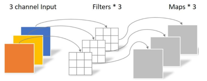 Depthwise 处理一个三通道的图像,使用3×3的卷积核,完全在二维平面上进行,卷积核的数量与输入的通道数相同,所以经过运算会生成3个feature map。卷积的参数为: 3 × 3 × 3 = 27.