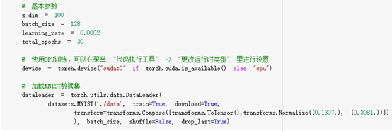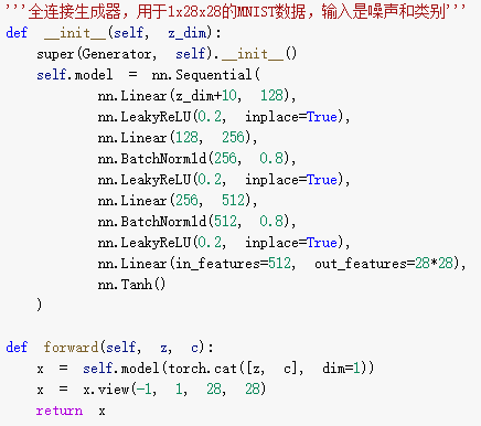 # 开始训练,一共训练total_epochs for epoch in range(total_epochs): # torch.nn.Module.train() 指的是模型启用 BatchNormalization 和 Dropout # torch.nn.Module.eval() 指的是模型不启用 BatchNormalization 和 Dropout # 因此,train()一般在训练时用到, eval() 一般在测试时用到 generator = generator.train() # 训练一个epoch for i, data in enumerate(dataloader): # 加载真实数据 real_images, real_labels = data real_images = real_images.to(device) # 把对应的标签转化成 one-hot 类型 tmp = torch.FloatTensor(real_labels.size(0), 10).zero_() real_labels = tmp.scatter_(dim=1, index=torch.LongTensor(real_labels.view(-1, 1)), value=1) real_labels = real_labels.to(device) # 生成数据 # 用正态分布中采样batch_size个随机噪声 z = torch.randn([batch_size, z_dim]).to(device) # 生成 batch_size 个 ont-hot 标签 c = torch.FloatTensor(batch_size, 10).zero_() c = c.scatter_(dim=1, index=torch.LongTensor(np.random.choice(10, batch_size).reshape([batch_size, 1])), value=1) c = c.to(device) # 生成数据 fake_images = generator(z,c) # 计算判别器损失,并优化判别器 real_loss = bce(discriminator(real_images, real_labels), ones) fake_loss = bce(discriminator(fake_images.detach(), c), zeros) d_loss = real_loss + fake_loss d_optimizer.zero_grad() d_loss.backward() d_optimizer.step() # 计算生成器损失,并优化生成器 g_loss = bce(discriminator(fake_images, c), ones) g_optimizer.zero_grad() g_loss.backward() g_optimizer.step() # 输出损失 print("[Epoch %d/%d] [D loss: %f] [G loss: %f]" % (epoch, total_epochs, d_loss.item(), g_loss.item()))