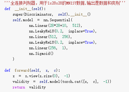 首先实现CGAN。下面分别是 判别器 和 生成器 的网络结构