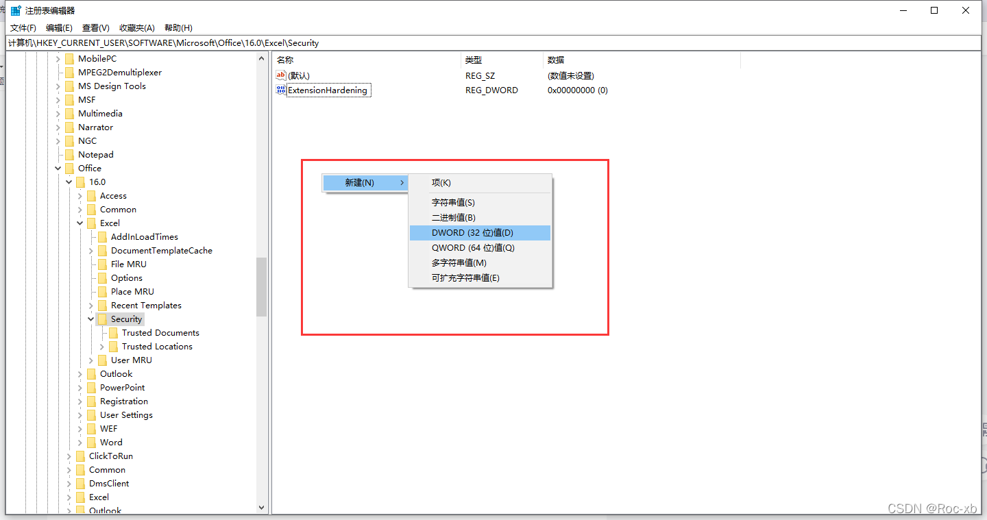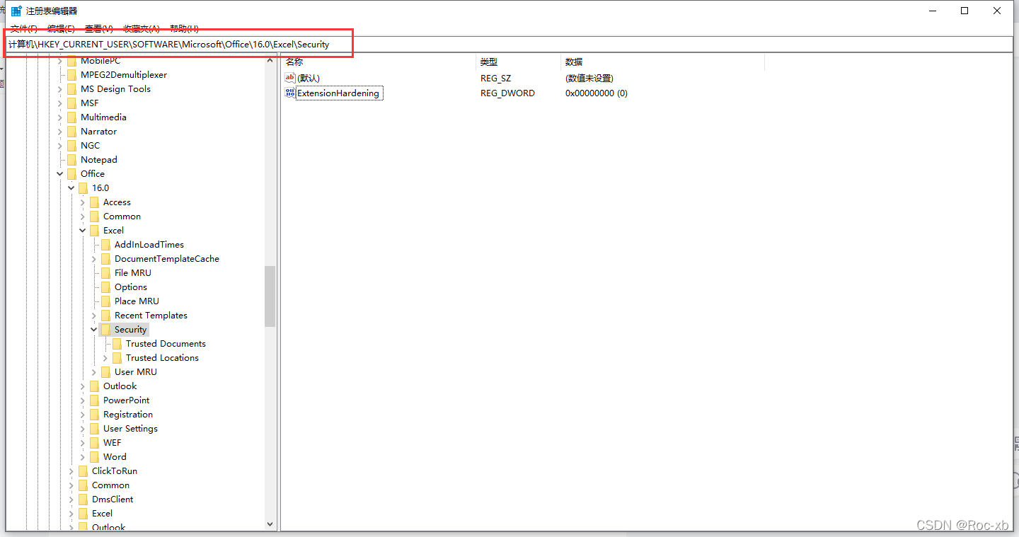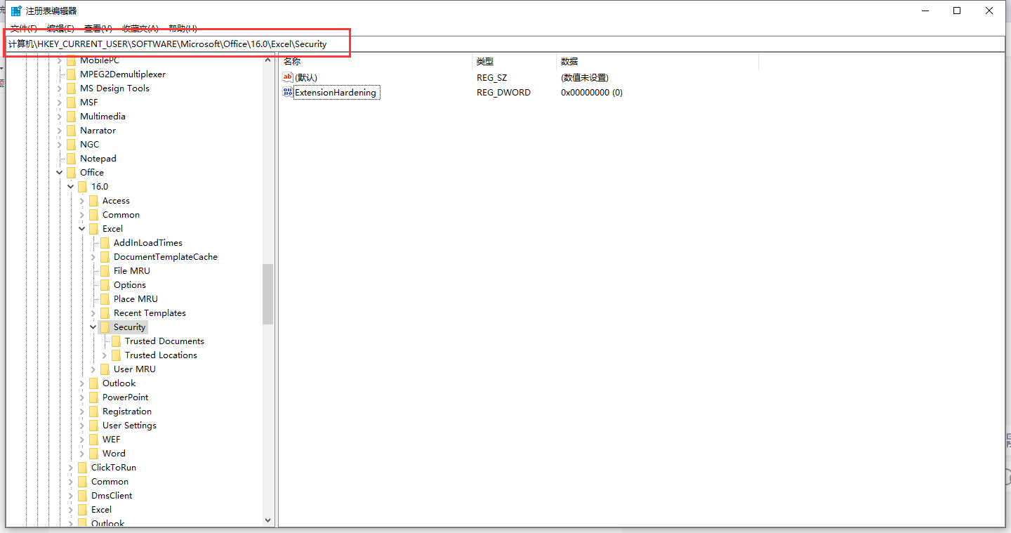 找到注册表子项:HKEY_CURRENT_USER\Software\Microsoft\Office\16.0\Excel\Security。