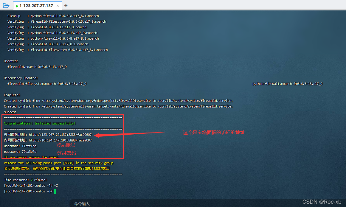 安装完成之后,可以看到宝塔的默认提供的一些信息(包括访问地址和登录账号信息)