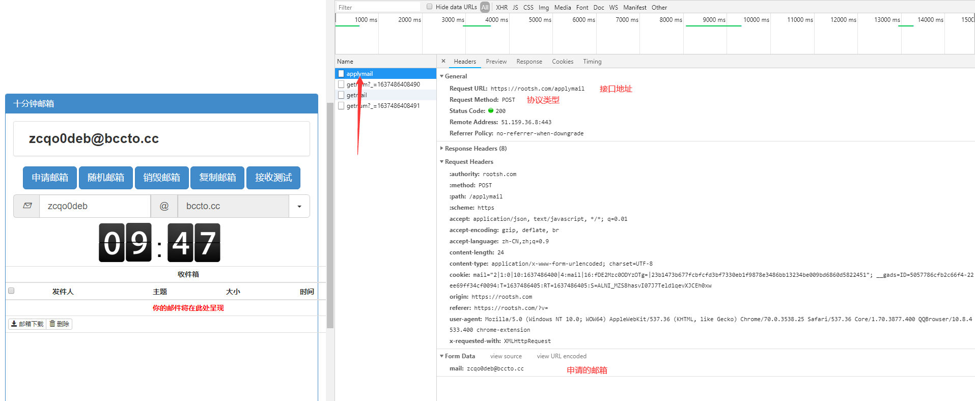 首先打开控制台,监听页面交互请求,先点随机生成一个邮箱,然后点击申请邮箱按钮。
