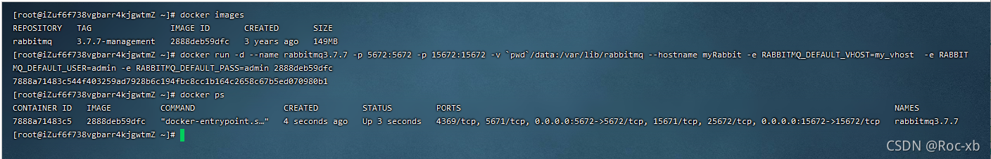 docker run -d --name rabbitmq3.7.7 -p 5672:5672 -p 15672:15672 -v `pwd`/data:/var/lib/rabbitmq --hostname myRabbit -e RABBITMQ_DEFAULT_VHOST=my_vhost -e RABBITMQ_DEFAULT_USER=admin -e RABBITMQ_DEFAULT_PASS=admin 2888deb59dfc