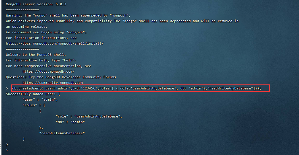 db.createUser({ user:'admin',pwd:'123456',roles:[ { role:'userAdminAnyDatabase', db: 'admin'},"readWriteAnyDatabase"]});