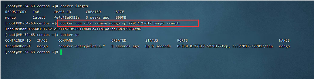docker run -itd --name mongo -p 27017:27017 mongo --auth