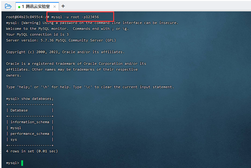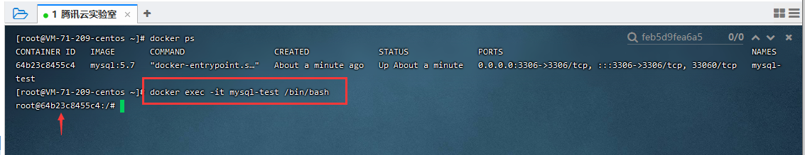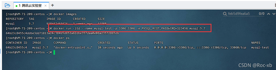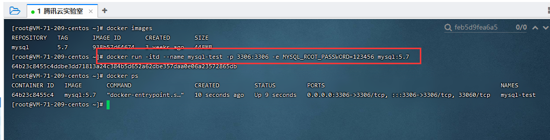 docker run -itd --name mysql-test -p 3306:3306 -e MYSQL_ROOT_PASSWORD=123456 mysql:5.7