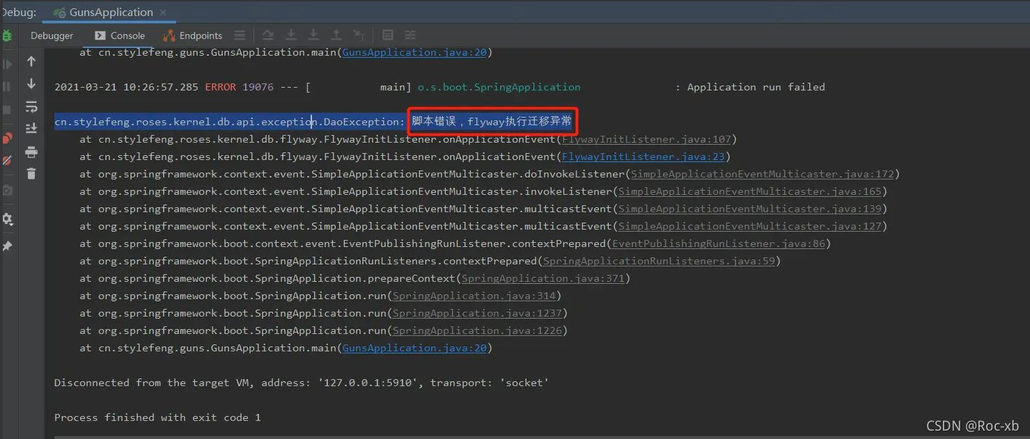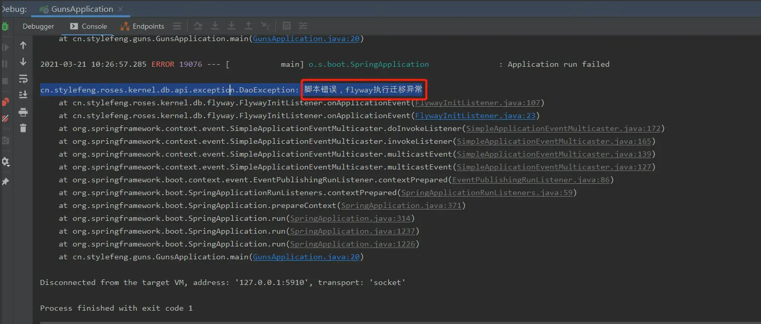 Guns启动项目抛出:脚本错误,flyway执行迁移异常