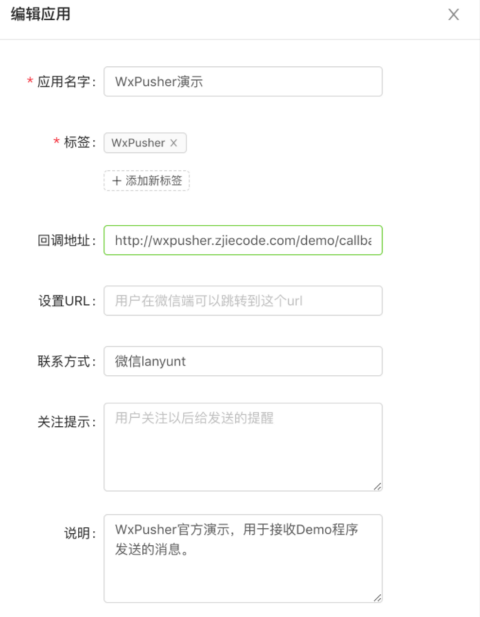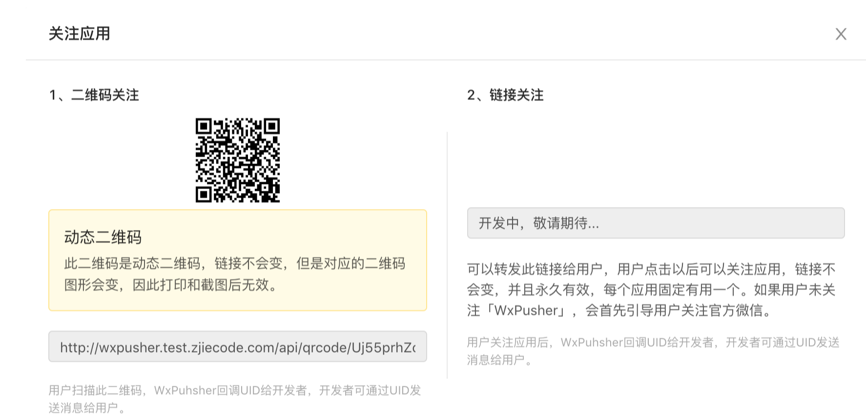 关注提示:用户关注或者扫应用码的时候发送给用户的提示,你可以不填写,Wxpusher会提供一个默认文案。你也可以在用户关注回调给你UID的时候,再主动推送一个提示消息给用户。