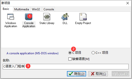 (2)选择Console Application,选择C项目,修改工程项目名称