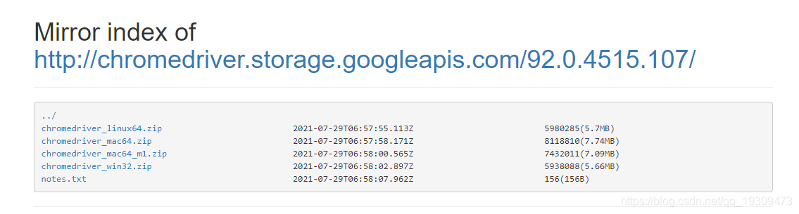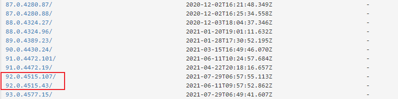 我们发现这里有【92.0.4515.107】和 【92.0/4515.43】两个版本,一般来说,这个两个版本都是使用的,但是我建议下载版本后面所对应日期与当前日期相近的版本最好。