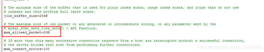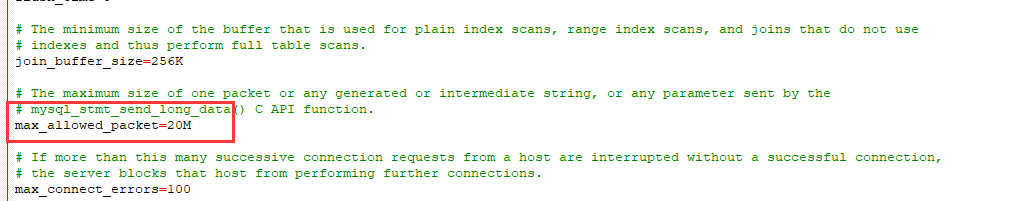 max_allowed_packet = 20M(最大可输入256M即256*1024*1024)