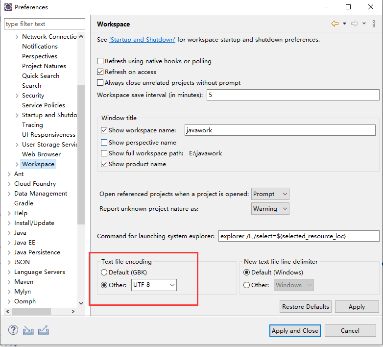 配置修改流程:Windows——>Preferences——>General——>Workspace——>Text file encoding 设置为UTF-8,然后点击Apply and Close进行保存