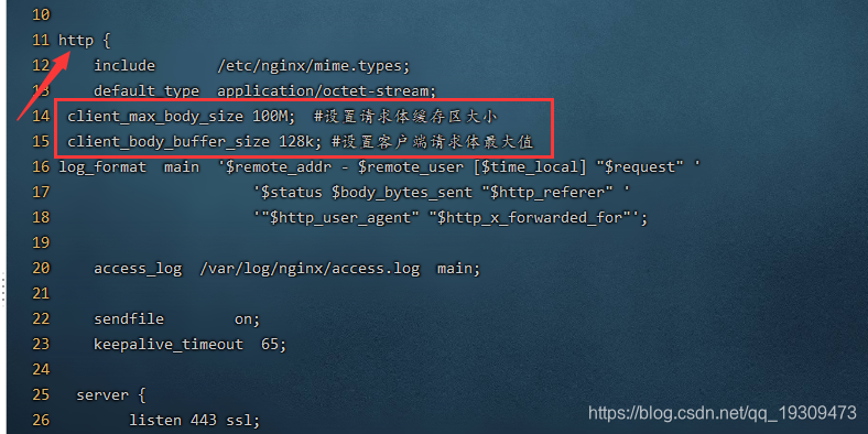 client_max_body_size 100M; # 设置请求体缓存区大小