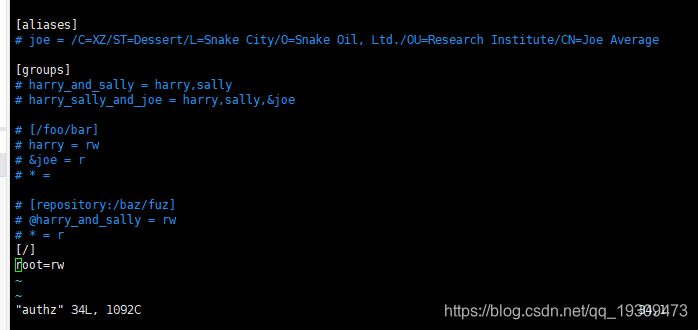 这里主要配置的是root=123456,也就是配置svn用户的账号和密码信息