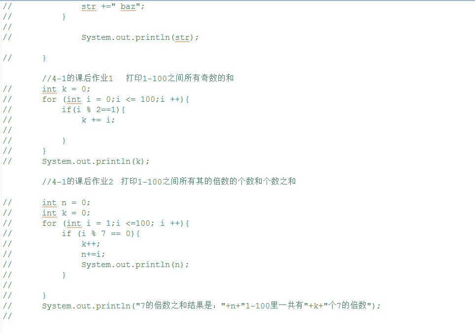 // System.out.println("7的倍数之和结果是:"+n+"1-100里一共有"+k+"个7的倍数");