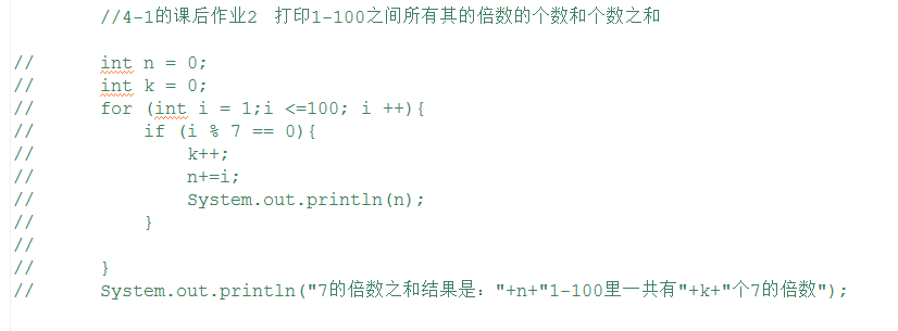 // System.out.println("7的倍数之和结果是:"+n+"1-100里一共有"+k+"个7的倍数");