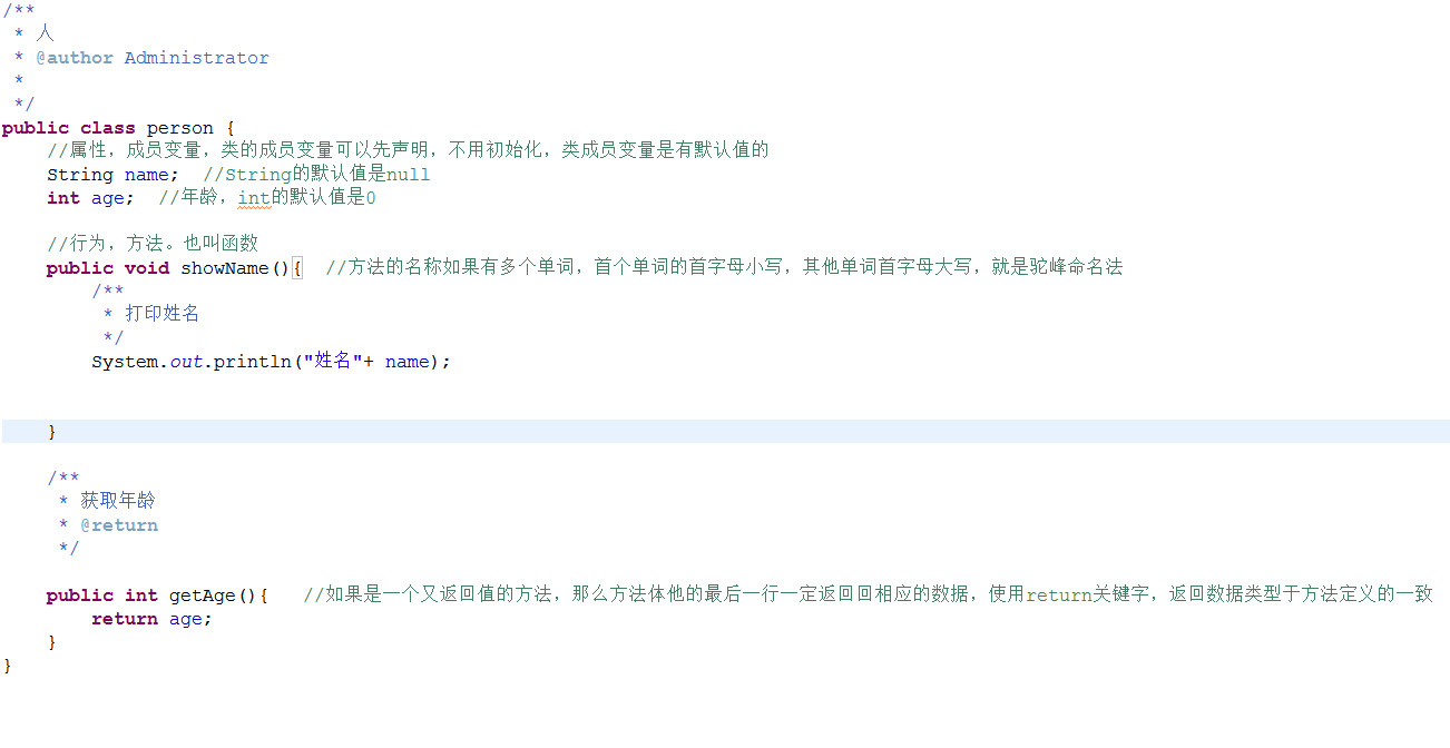 public int getAge(){ //如果是一个又返回值的方法,那么方法体他的最后一行一定返回回相应的数据,使用return关键字,返回数据类型于方法定义的一致