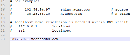 4、在C:\Windows\System32\drivers\etc目录下的hosts文件,以管理员权限打开,在下面添加127.0.0.1 testhosts.com