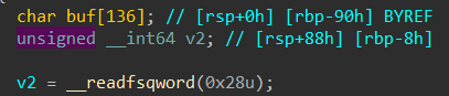 从buf到canary相距0x90-0x8=0x88 0x88/8=17 再加上之前6字节偏移,要在第23泄露