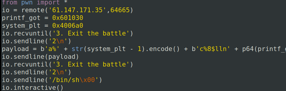 思路二,利用格式化字符串将printf的got地址修改成system的plt地址,再次选择2,输入/bin/sh\x00,尝试调用shell