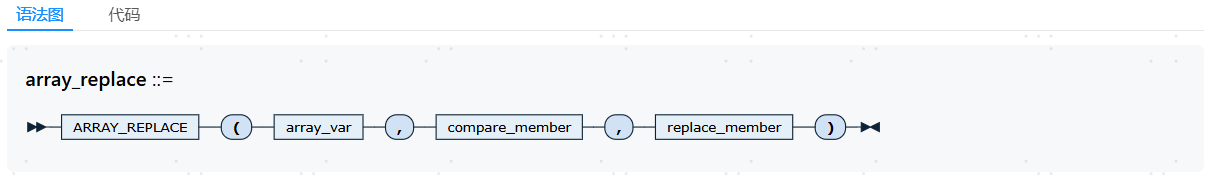 ARRAY_REPLACE函数将数组(数组变量,数组对象,数组类型)array_var中所有与compare_member相同的成员替换为replace_member,并返回替换后的数组。