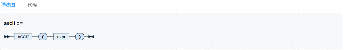 ASCII函数将expr表示的一个字符转换为ASCII码,返回一个INT类型的数值。
