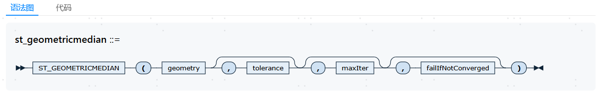 ST_GEOMETRICMEDIAN函数的功能是使用Weiszfeld算法计算MULTIPOINT数据的几何中位数。最终会返回一个POINT数据,该POINT到MULTIPOINT的所有POINT的距离之和是最小的。
