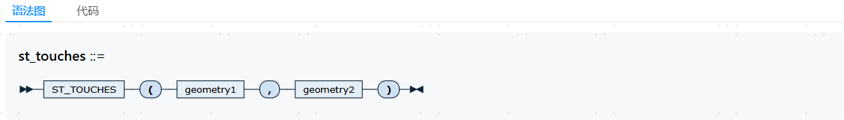 ST_TOUCHES函数的功能是判断两个Geometry是否至少有一个共同点,且它们的内部不相交。如geometry1和geometry2相交,且它们的内部不相交,则返回TRUE,否则返回FALSE。