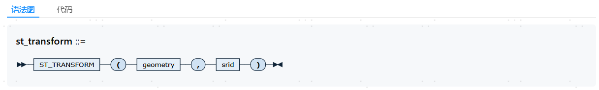 ST_TRANSFORM函数根据输入的geometry和srid,返回geometry从原本的空间参考系转换到srid所指定的空间参考系的坐标数据的新geometry。