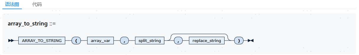 ARRAY_TO_STRING函数将数组(数组变量,数组对象,数组类型)array_var的成员以split_string作为分隔符进行连接,若数组成员中存在NULL且replace_string非空,则将NULL成员替换为replace_string后进行连接,函数返回一个VARCHAR类型的字符串。