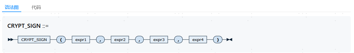 CRYPT_SIGN函数以expr2为签名者需要提供的私钥、以expr3为签名私钥的算法类型、以expr4为签名者的签名ID对expr1的数据进行签名,返回一个HEX格式的VARCHAR类型的签名串。