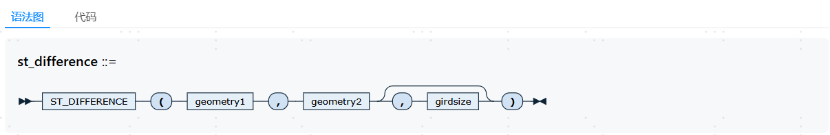 ST_DIFFERENCE函数返回包含geometry1但不包含geometry2几何图形,返回值为ST_GEOMETRY类型数据。