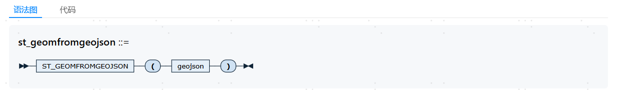 ST_GEOMFROMGEOJSON函数根据输入的geojson,返回该geojson对应的ST_GEOMETRY类型数据。只支持二维几何图形,三维几何图形会报错。