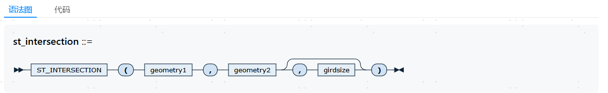 ST_INTERSECTION函数返回两个geometry对象的交集,返回值为ST_GEOMETRY类型数据。