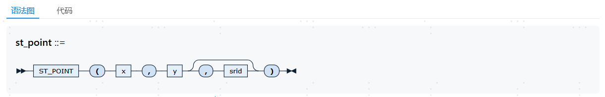 ST_POINT函数根据输入的x、y和可选的srid,返回对应坐标和srid的POINT数据。