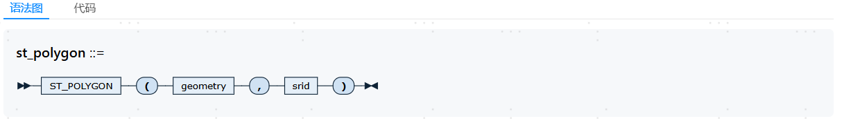 ST_POLYGON函数根据输入的geometry和srid,返回对应srid中由geometry组成的POLYGON数据。