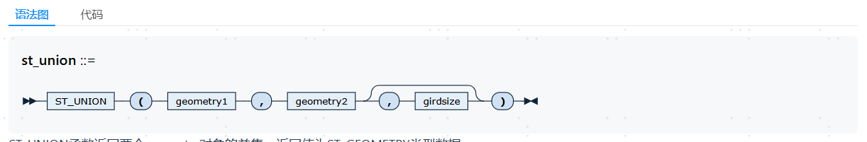 ST_UNION函数返回两个geometry对象的并集,返回值为ST_GEOMETRY类型数据。