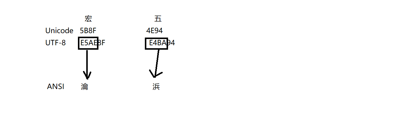 搞明白以上几个点之后 ,我回过头了看我的那个乱码问题,首先我观察到我的记事本的编码形式是UTF-8,在UTF-8编码中 宏 对应E5AE8F,而 五 对应E4BA94.然后我又观察到我的microsoft visual studio 的控制台的代码页是 936(ANSI/OEM - 简体中文 GBK)两个的编码形式不同自然会乱码。GBK用两个字节来表示一个中文,因此我们取出宏对应的E5AE8F前两位 E5AE 转化为gb2312编码得到汉字瀹 将五 对应E4BA94 取出前两位 E4BA 得到浜,剩下的两个1位8F 94超过了7F不是ascll编码,而且只有一位也不是gb2312编码,因而查无此编码输出?。所以解决的办法是,将控制台和记事本编码方式对应,将记事本另存为编码方式为ANSI即可。