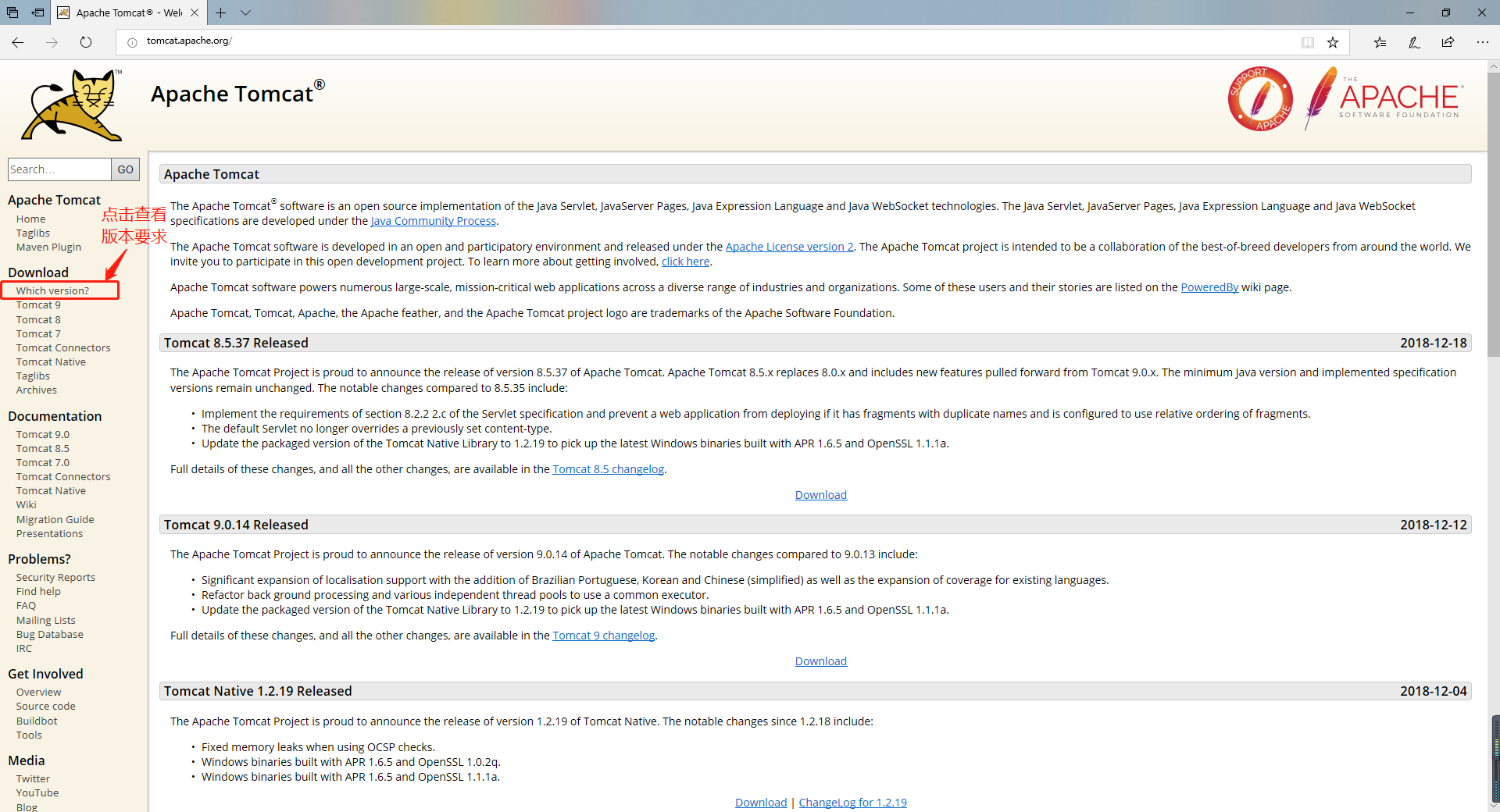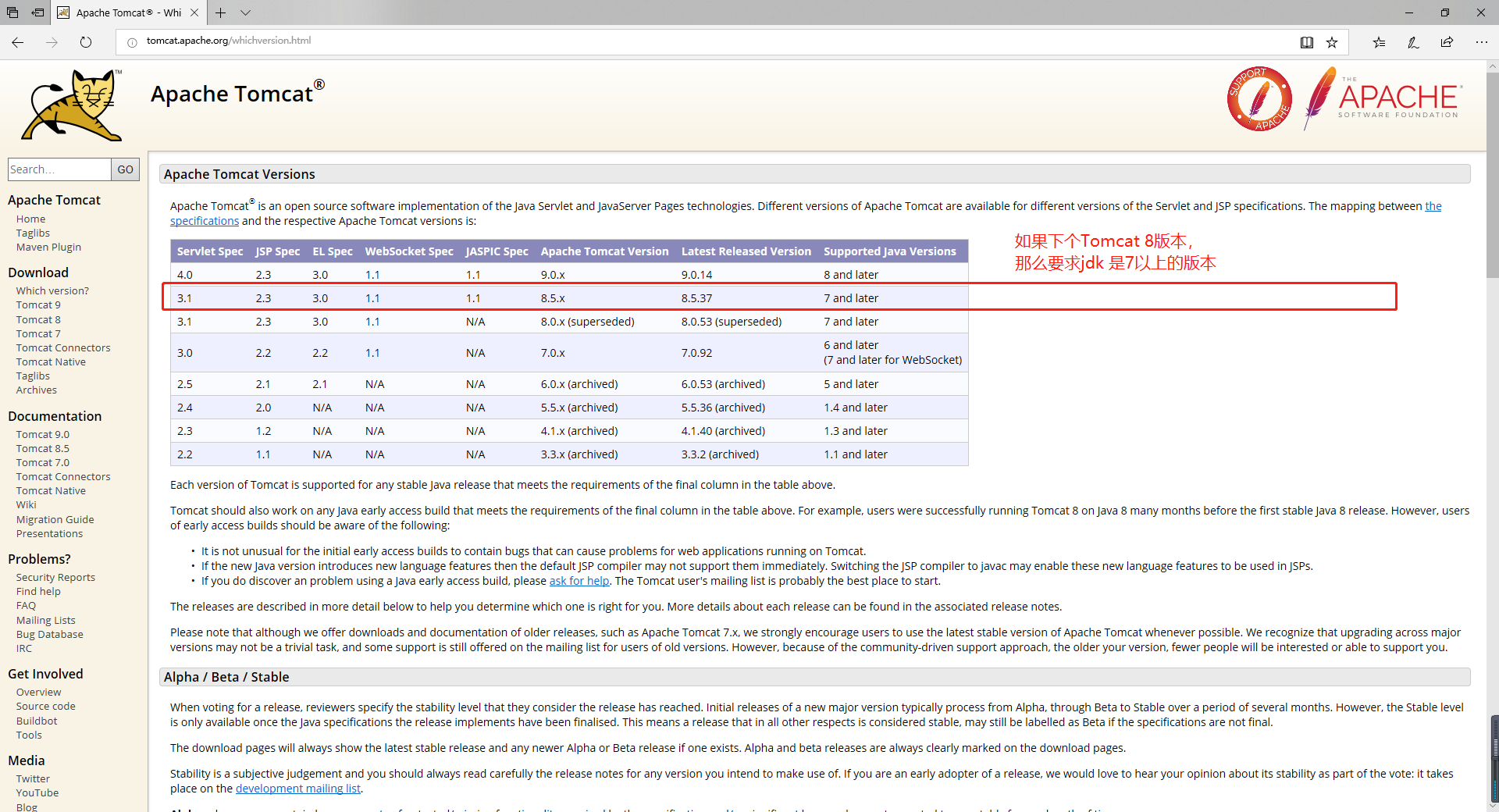因为Tomcat的运行要依赖Java jdk ,所以在选择Tomcat版本的时候,需要注意一下对jdk版本的要求,如图: