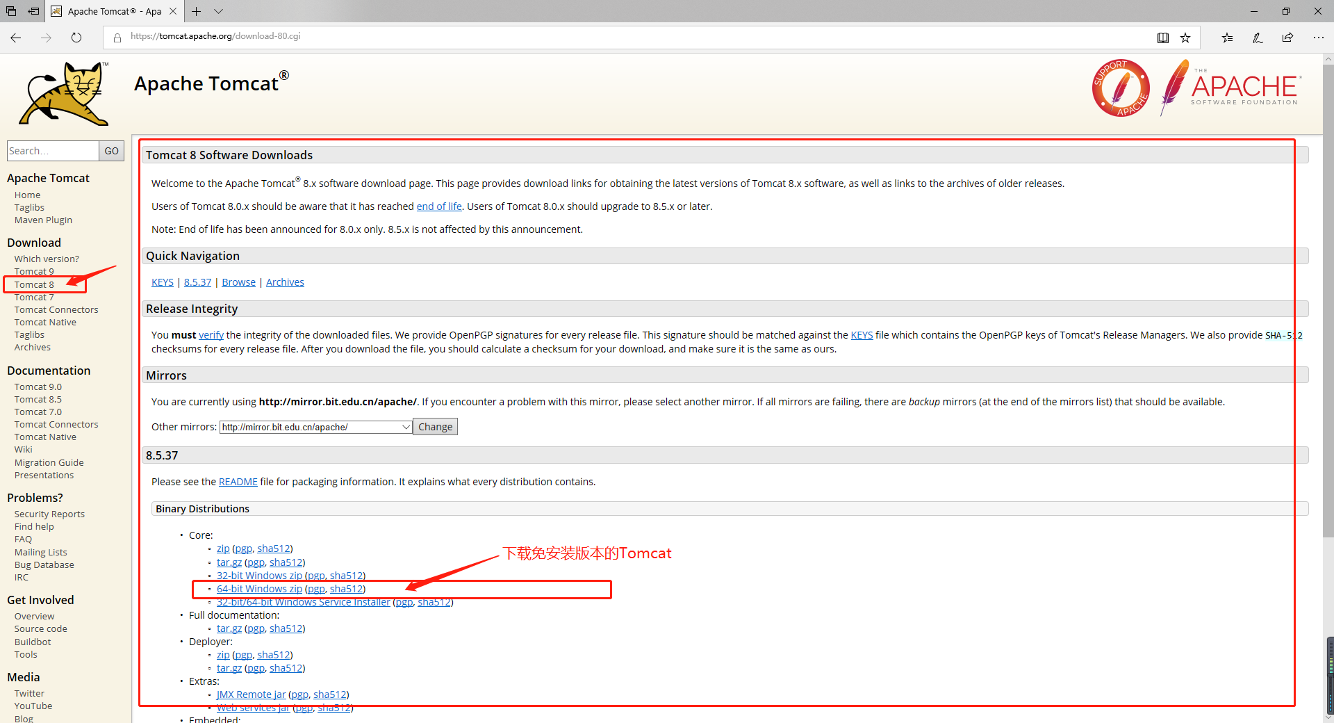 通过DOS命令窗口可以看出本机系统给使用的是 1.8版本的jdk 64位,OK,那么我们可以选择8版本的Tomcat,如图: