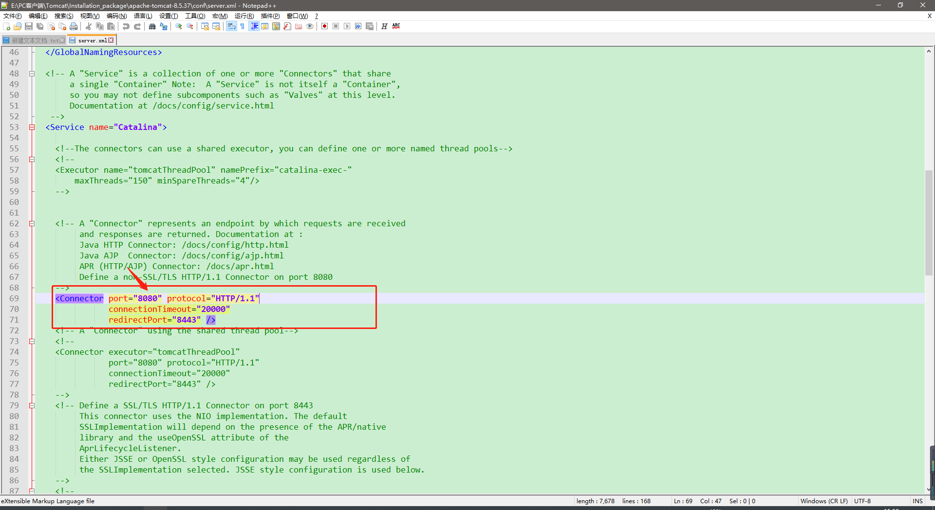 因Tomcat默认的端口号时8080,但是8080端口很容易被其它服务端占用,所有有时,我们需要改端口号,如果要修改端口号,就再service.xml路径下修改,如图: