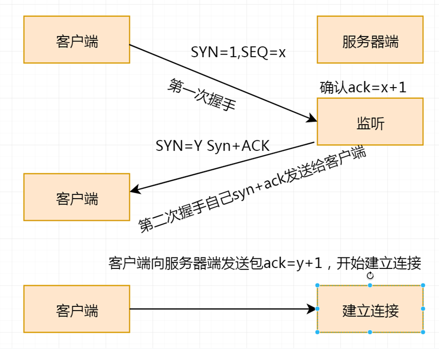 第三次握手:客户端接受syn(随机数Y)+ack,向服务器端发送ack=y+1,此包发送完毕即可 建立tcp连接。