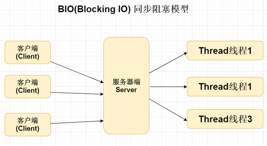 1、BIO(Blocking I O) 同步阻塞模型,一个线程对应一个客户端连接。