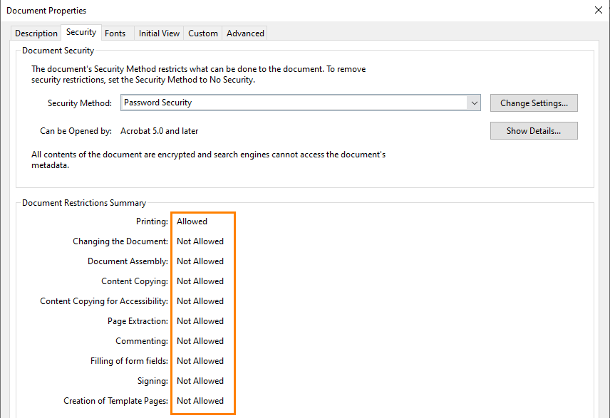 public class ChangeSecurityPermissions { public static void main(String[] args) { // 创建 PDF 文档对象 PdfDocument doc = new PdfDocument(); // 载入原始 PDF 文件 doc.loadFromFile("/示例文档.pdf"); // 设置打开密码(留空表示无需打开密码) String openPsd = ""; // 设置权限密码(修改权限需输入该密码) String permissionPsd = "PDF密码"; // 设置允许的操作权限(这里只允许打印和高质量打印) EnumSet permissionsFlags = EnumSet.of( PdfPermissionsFlags.Print, PdfPermissionsFlags.Full_Quality_Print); // 加密文档,设定密码、权限和加密方式(128 位加密) doc.getSecurity().encrypt( openPsd, permissionPsd, permissionsFlags, PdfEncryptionKeySize.Key_128_Bit); // 保存加密后的 PDF 文件 doc.saveToFile("/添加安全权限.pdf"); } }