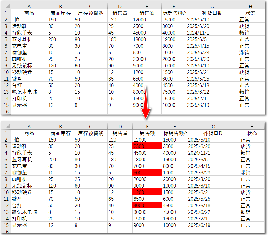 // 对 E2:E15 区域添加条件格式:销售额小于 5000 时背景变红
