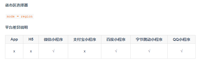 picker mode = region 不支持APP端 和 H5 支付宝小程序