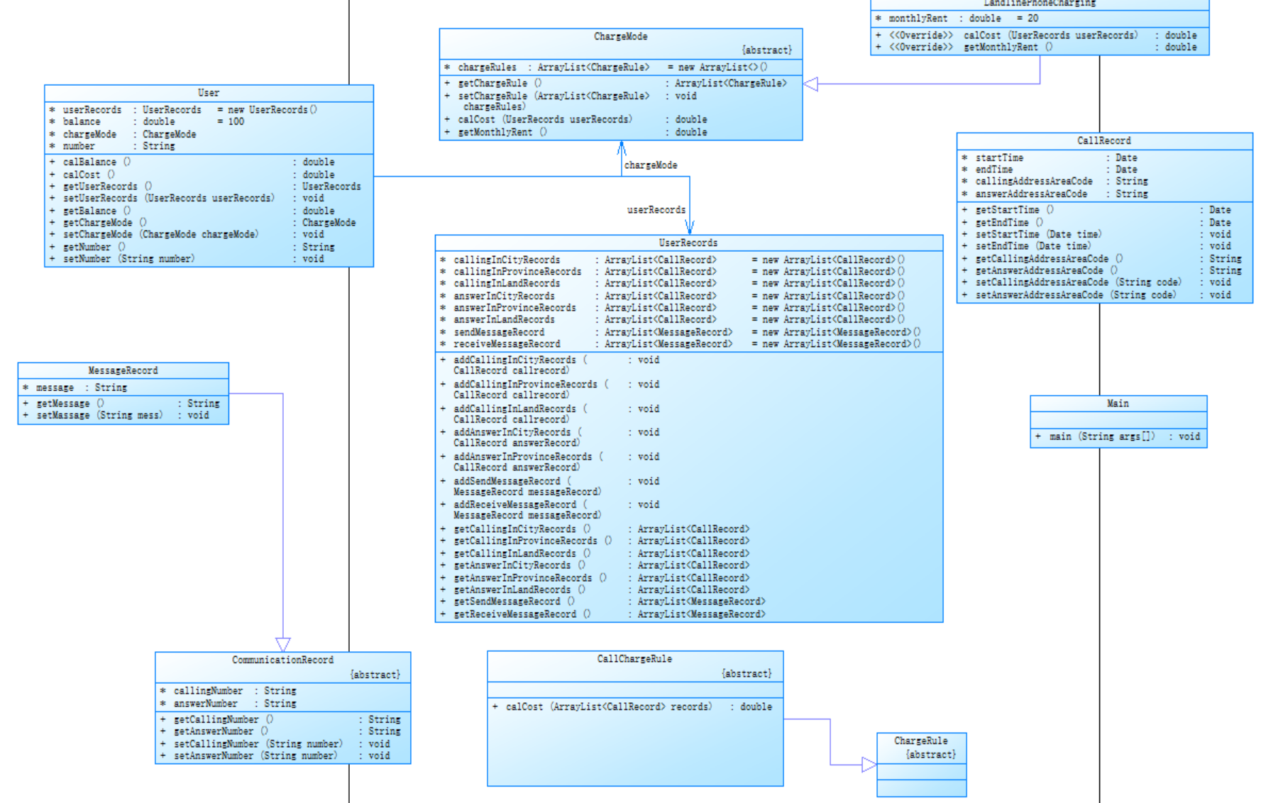 此次的作业收获还是很多的,又是一次新的,从来没有试过的设计方式,以前都是将如何收费写成函数或者直接写在计算收费里面,这次则是更加细化,将其写成类;以前会将座机收费模式、手机收费模式写在main里面,分区域进行处理计算,而这次则是写成了类并且作为User的属性。具有着非常强的拓展性。