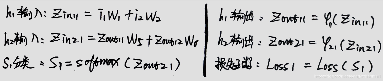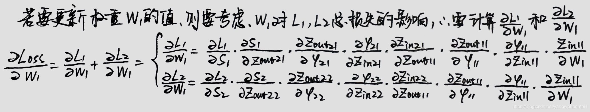 在笔记中给出两个公式,结合前面笔记的神经网络结构图,可以看出在网络的最后有两个输出,分别为S1和S2,两个输出结果分别各得出一个损失函数,Loss1和Loss2.对于一个权重值来说,每个损失值都会对其产生影响,所以我们更新权重W1的时候,要分别考虑两个损失函数对其产生的影响,所以这就是笔记中出现两个求导公式原因。